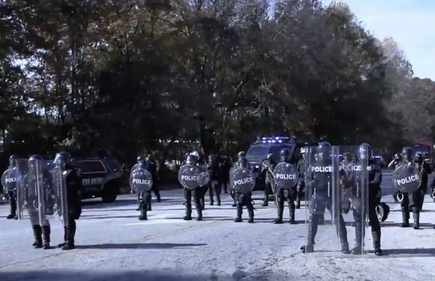 That morning, protesters were met by a line of police in full riot gear in what became a violent confrontation between unarmed protesters and police armed with tactical gear, AR-15 rifles, and other military-industry style weapons. Police used tear gas, smoke grenades, and rubber bullets against the crowd. It was also reported that a long-range acoustic device (LRAD) machine was on site, as well. In a press conference later that day, Atlanta officials acknowledged eight law enforcement agencies for their collaboration in the response to the Block Cop City protest. Construction was reportedly stopped at the site that day.