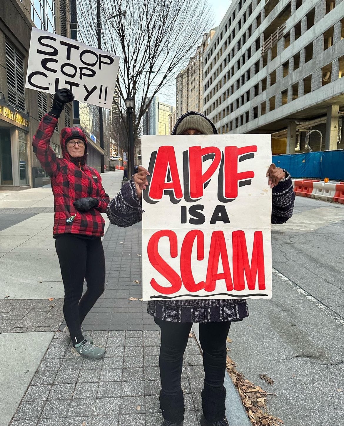 ATLANTA—Early Monday morning, two Stop Cop City activists used reinforced pipes to lock themselves to construction equipment at a Brasfield & Gorrie work site in Midtown Atlanta. Due to the protest, all vehicle entrances to the facility were blocked and construction at the site was completely halted. Police responded around 6:30 a.m. and removed the activists by 11 a.m.